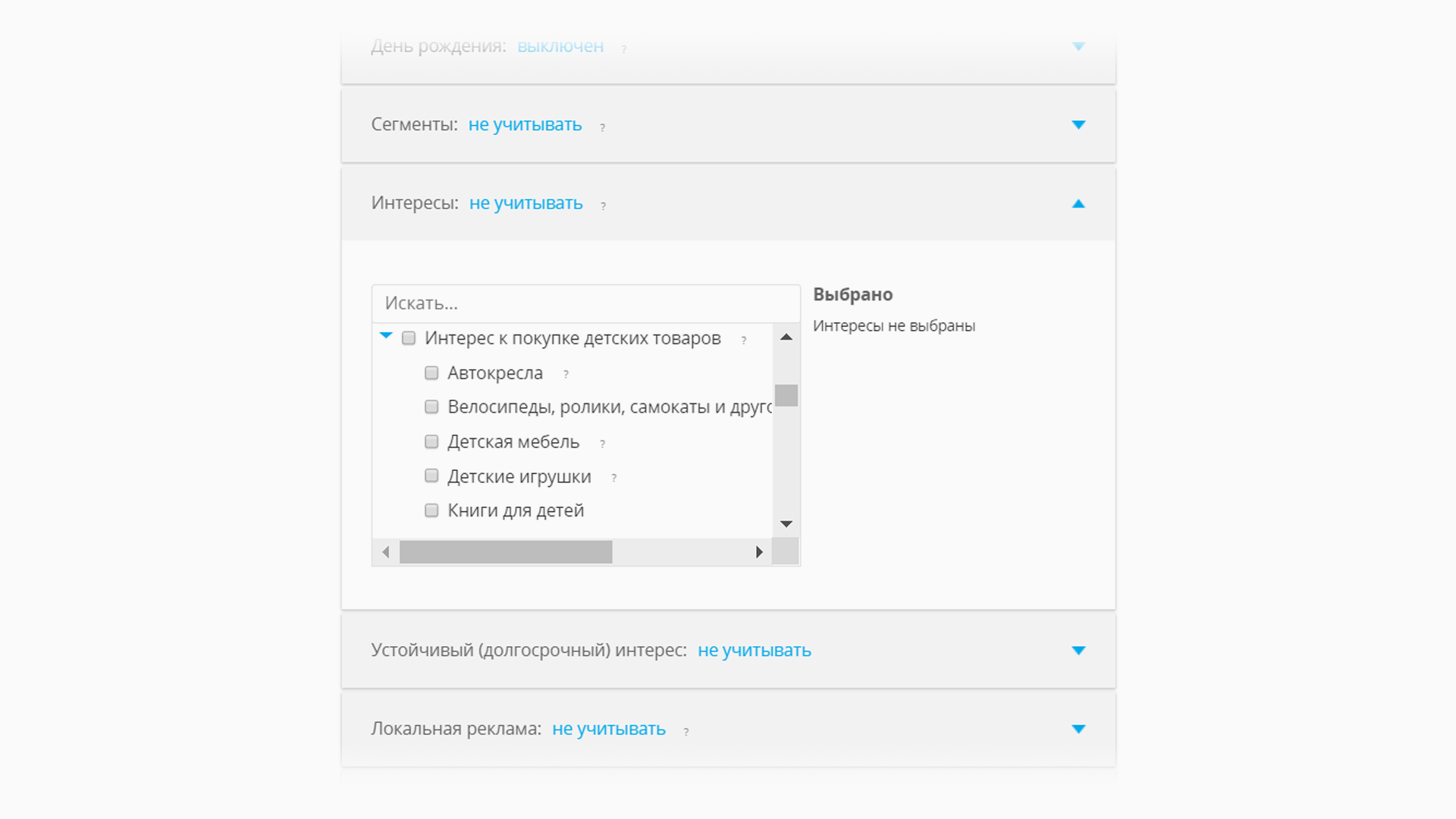 Настройка кампаний на пользователей поддерживает следующие атрибуты: автокресла, велосипеды, ролики, самокаты и другой детский транспорт; детская мебель, детские игрушки, книги для детей, коляски; развивающие игрушки; санки, лыжи, снегокаты и другие товары для зимней активности; товары для новорожденных и товары для школы.