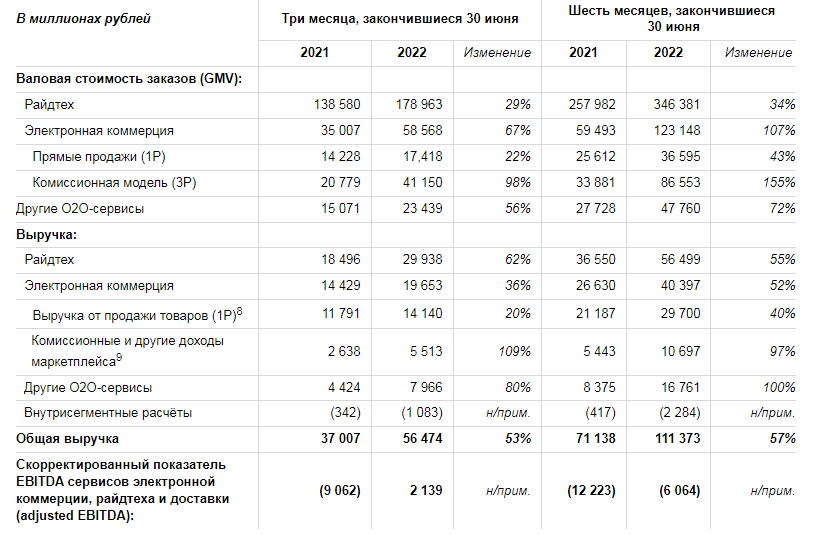 Во втором квартале 2022 года товарооборот (GMV) eСommerce-подразделения компании "Яндекс" (включает Маркет, доставку продуктов в Еде и Лавку в России) вырос на 67% по сравнению с аналогичным показателем за второй квартал прошлого года. Общий его объём составил 35 млрд руб. При этом всего в первом полугодии 2022 года он вырос на 107% по сравнению с первой половиной прошлого года и составил 123,1 млрд рублей.