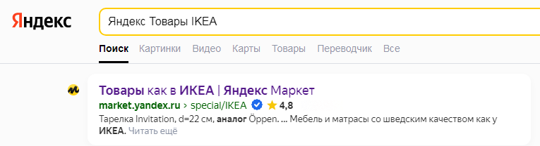 При этом уже в августе на Маркете появился раздел "Товары IKEA и аналоги", который потом несколько раз расширялся. Сейчас именно там продаются товары IKEA. Слово "аналоги" из баннеров пропало, однако описание раздела до сих пор звучит как "товары как в ИКЕА".