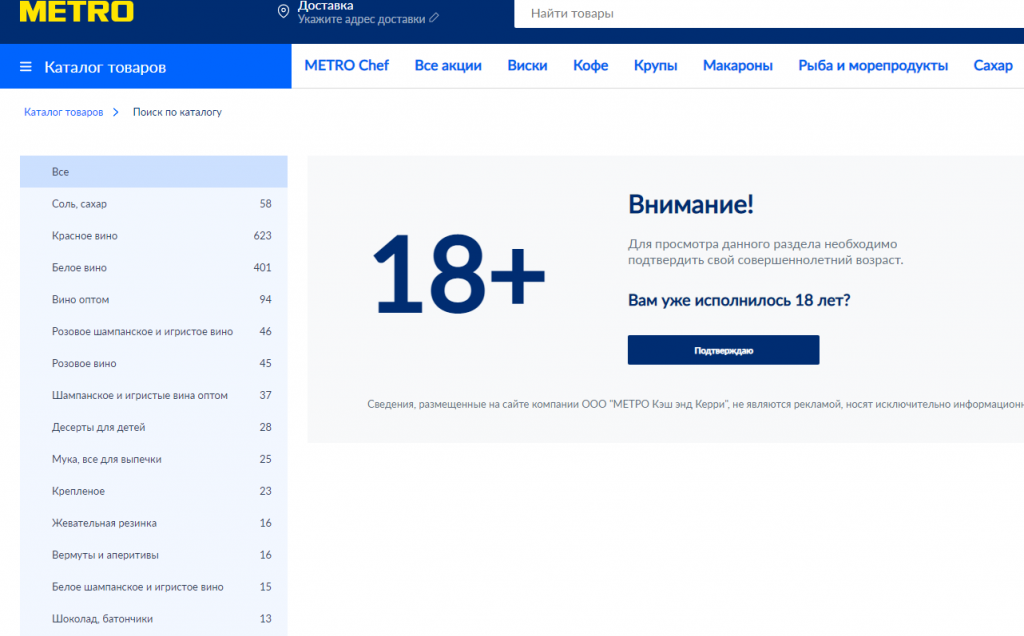 Сайт магазина METRO Cash & Carry ввёл возрастные ограничения для тех, кто хочет купить сахар. При поиске в каталоге этого товара посетителю сайта требуется подтвердить, что ему больше 18 лет.