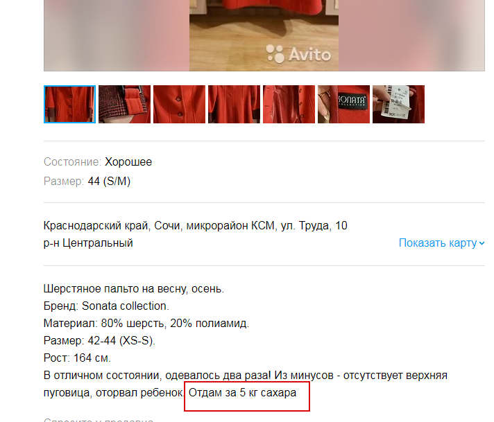Между тем, торговые сети по всей стране ограничивают продажи сахара, а на Avito появляются объявления формата "Отдам пальто за сахар".