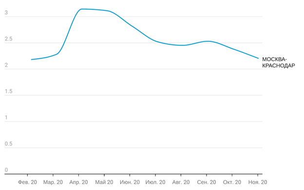 Рис. 2 Сроки доставки по направлениям Москва - Краснодар февраль - ноябрь 2020