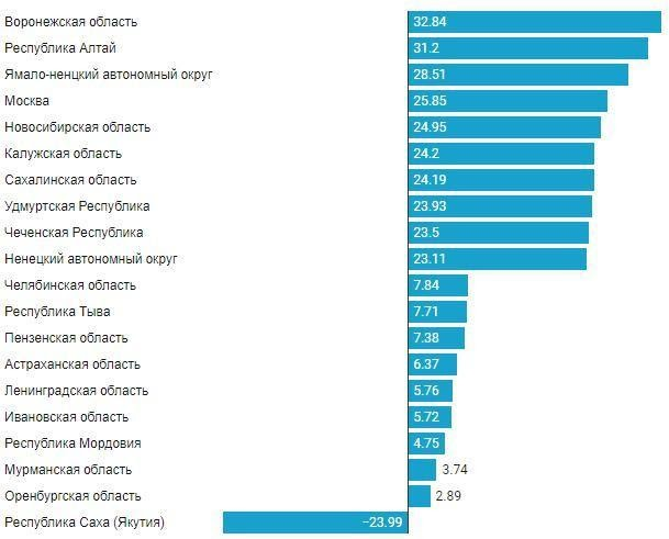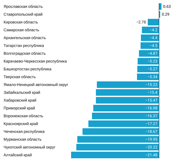 Рис. 3 Регионы с наиболее и наименее увеличившимися сроками доставки в 2020 г.