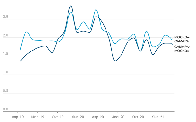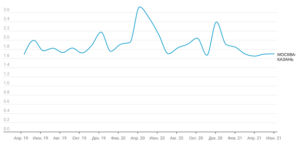 Рассмотрим на примере направления Москва-Казань, как менялась оперативность логистов в период пандемии и новогодних праздников (рис. 8).