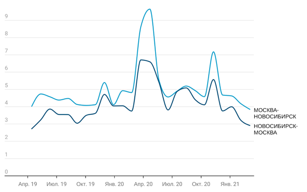 Рис. 1 Сроки доставки по направлениям Москва - Новосибирск и Новосибирск - Москва, апрель 2019 - апрель 2020