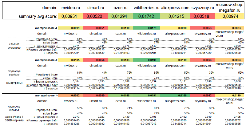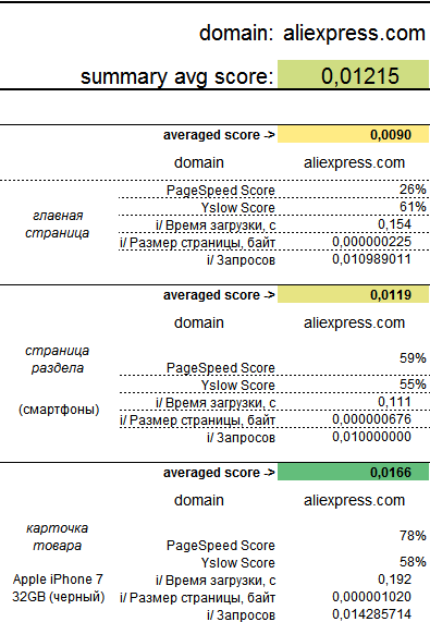 Посмотрим по столбцам некоторых участников забега: Алиэкспресс активно работает с привлечением трафика на карточки товара , поэтому score с погружением в глубину увеличивается. При их габарите (около 3.5 млн визитов в сутки; у топ российского е-коммерс — порядка 800 тыс ) собирать трафик на главную страницу можно только с тизерок на охлаждающуюся аудиторию и рекрутируя тех случайных посетителей, кто ещё не знает — что такое сила китайской кросс-бордерной торговли. Чем ближе к корзине заказа, тем интенсивность вылизывания кода и скорости нарастает: никто не хочет потерять покупателя на огромной, перегруженной графикой и кодами странице.