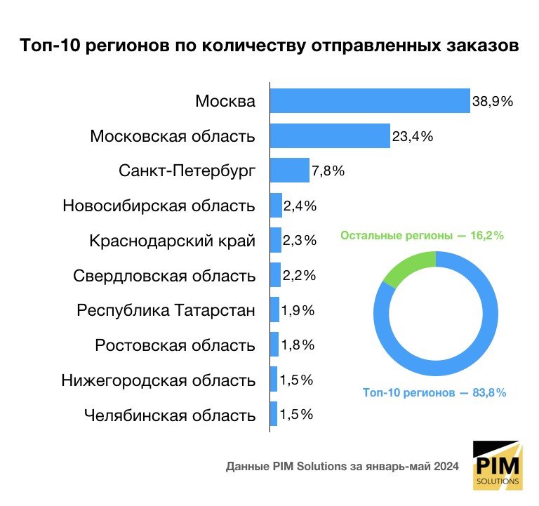 В целом на первую десятку регионов по отправке заказов приходится 84% от общего числа.