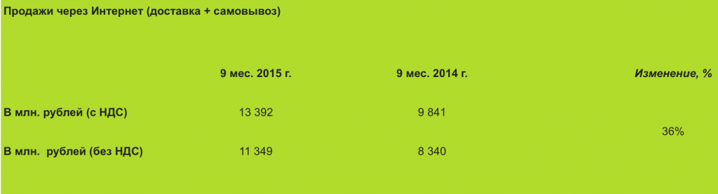 Интернет-продажи «М.Видео» (онлайн-заказы: доставка на дом + самовывоз из магазинов) за 9 месяцев 2015 года выросли на 36% до 13,4 млрд. рублей (с НДС) против 9,8 млрд. рублей (с НДС) в аналогичном периоде прошлого года.