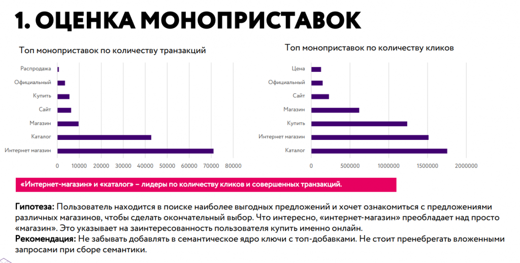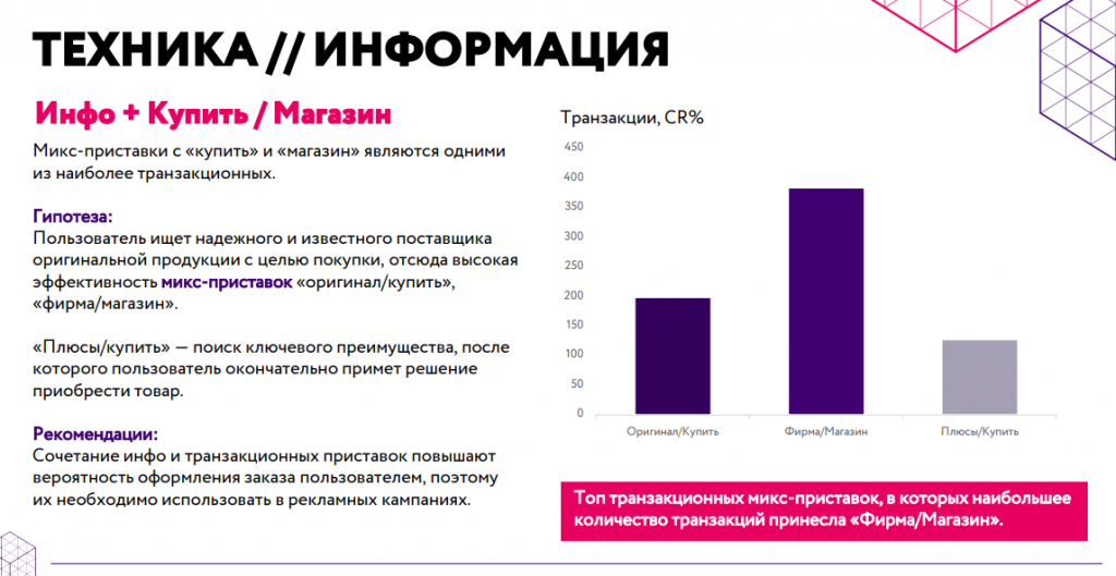 В частности, в сегменте электроники на самом верхнем уровне покупательской воронки, на этапе поиска информации, больше всего транзакций происходит по запросам, в которых есть слова "Фирма", "Плюсы", "Оригинал", "Личный кабинет".