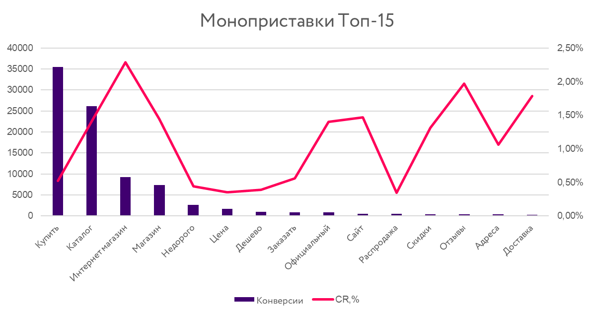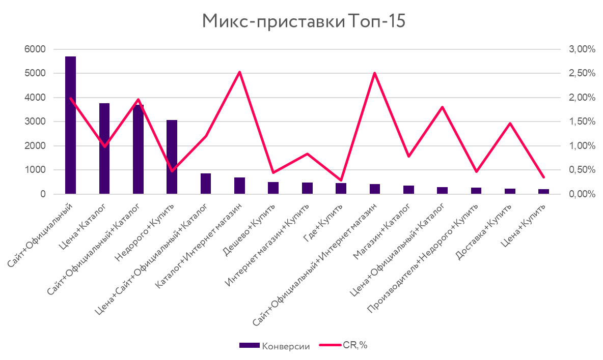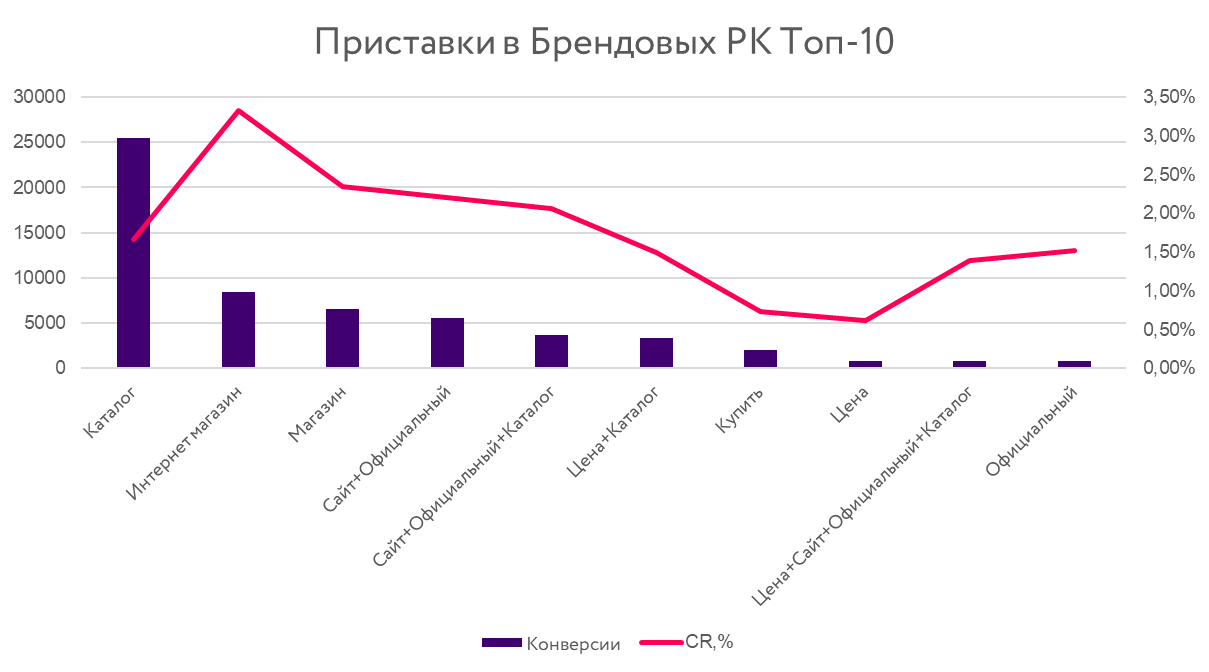 Высокая конверсионность различных сочетаний со словом «официальный» обусловлена желанием пользователей покупать оригинальный товар у конкретного ритейлера. Такие приставки повышают уровень доверия покупателя к магазину, особенно на финальных этапах воронки, когда он уже определился с местом приобретения товара. По этой же причине высокий CR и у микс-приставок со словом «каталог» в брендовых рекламных кампаниях.