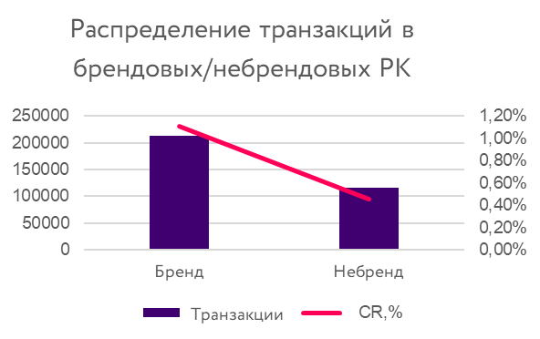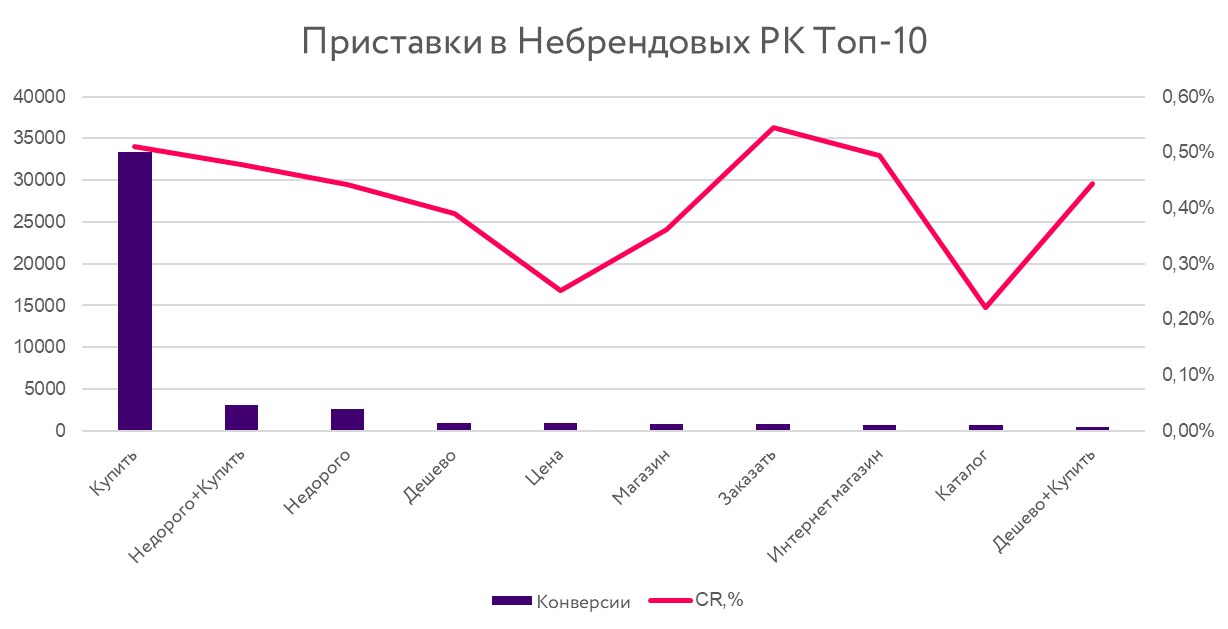 Для небрендовых кампаний характерны транзакционные добавки, типа «купить», а также слова, используемые при поиске выгодных решений — «недорого», «цена» и т.п.