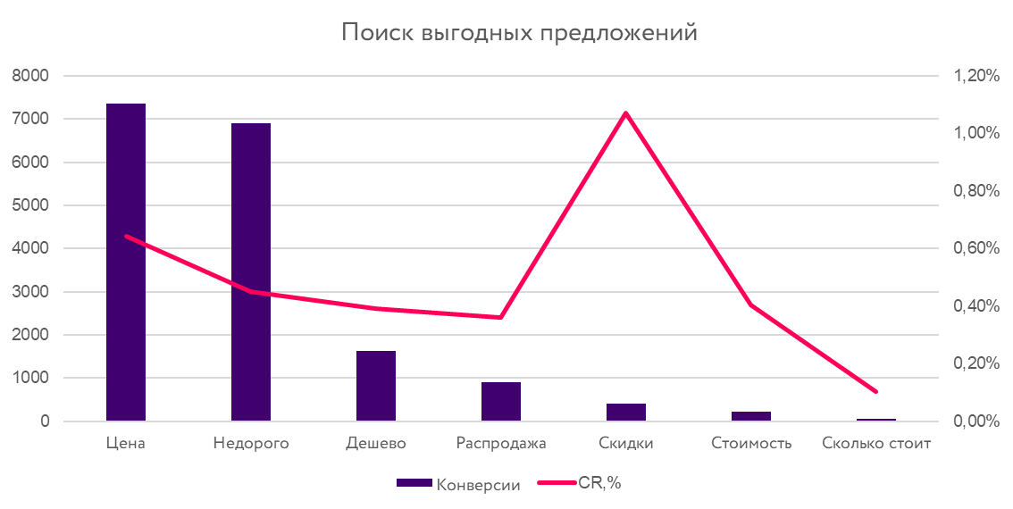 Путь пользователя для отрасли «Мебель» заметно длиннее, чем в других сегментах e-commerce. На этапе принятия решения о покупке не последнюю роль играет стоимость готового изделия. Поэтому для сегмента «Мебель» характерно использование запросов с «ценой», «недорого», «дешево», «скидки».