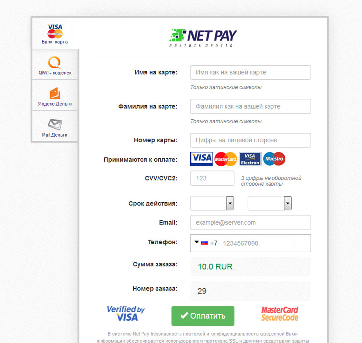 Net Pay — агрегатор, который работает с популярными платёжными системами — MasterCard, Maestro, Деньги@mail.ru, Яндекс.Деньги, WebMoney, Visa QIWI Wallet, Visa и Visa Electron.