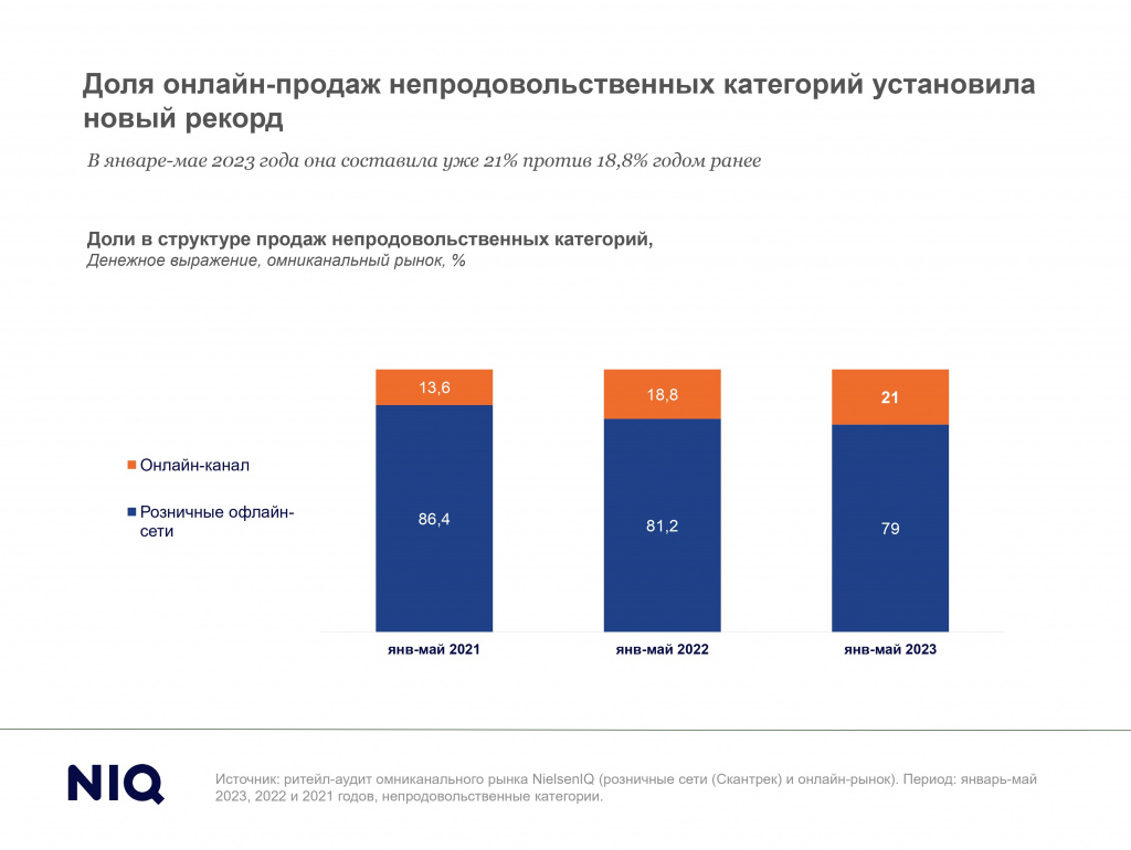 Текущий уровень интернет-продаж непродовольственных категорий установил на омниканальном рынке новый рекорд. Как сообщают эксперты Нильсен, за период января-мая 2023 года он достиг 21% (годом ранее доля онлайн-продаж колебалась на уровне 18%). Иными словами, к маю 2023 года уже пятая часть непродовольственных FMCG-товаров продается онлайн.