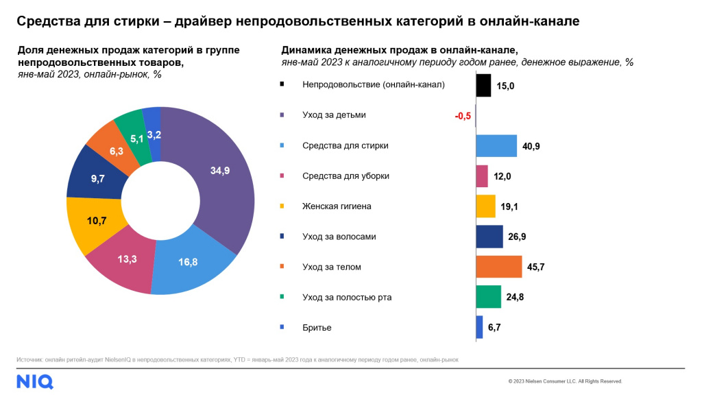 Один из ключевых факторов роста онлайн-канала в структуре продаж - развитие категории средств для стирки, которая показала один из самых высоких приростов в индустрии (+40,9% в денежном выражении), а ее доля онлайн-продаж выросла с 13,9% годом ранее до 19,5%.