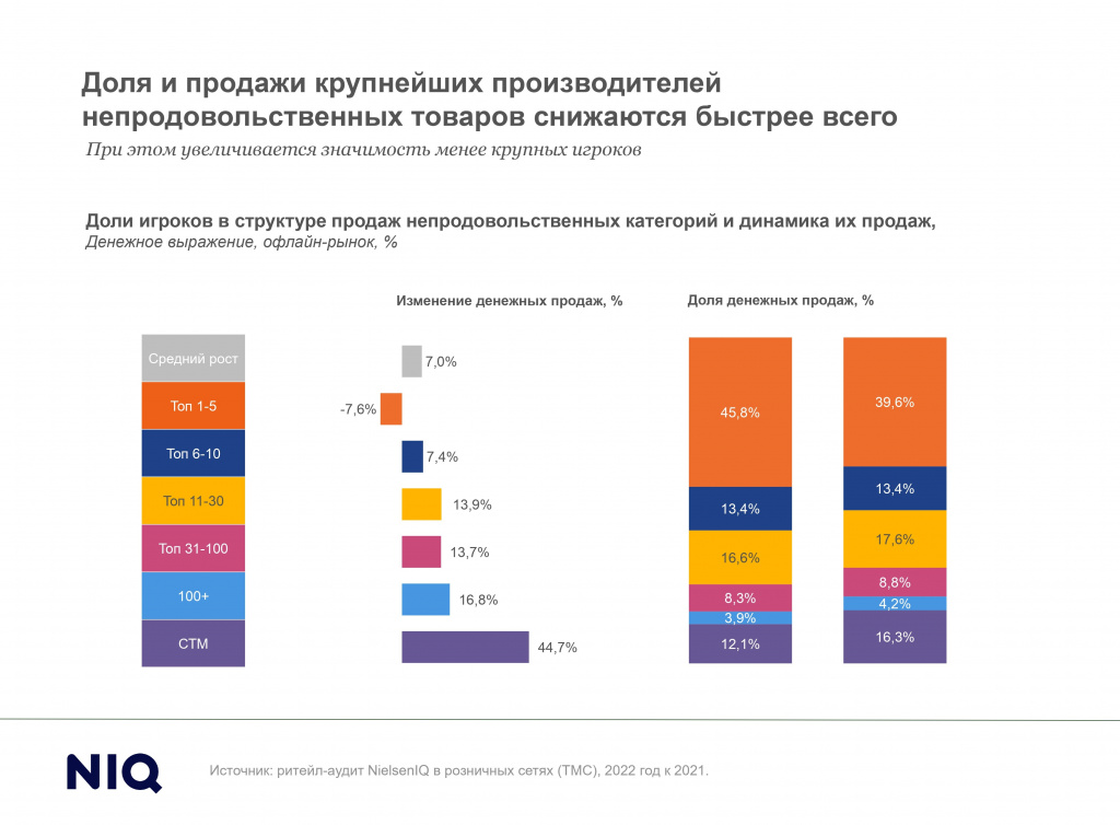 В 2022 году непродовольственная группа товаров пострадала сильнее всего с точки зрения ассортимента (сужение составило -16,2%), однако этот же процесс открыл новые возможности для небольших игроков и СТМ.