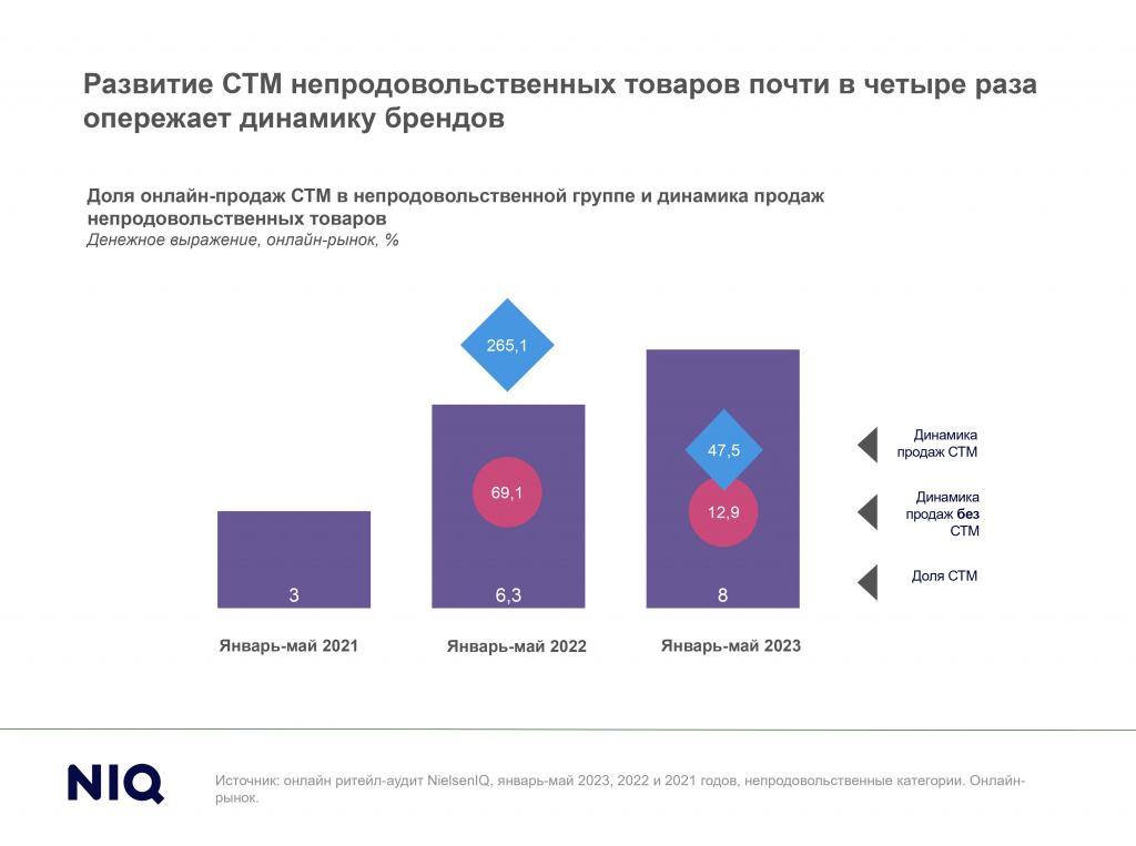 Одновременно с этим развитие СТМ непродовольственных товаров почти в четыре раза опережает динамику продаж брендированной продукции: +47,5% в денежном выражении против +12,9%. Непродовольственные частные марки активно наращивают и долю интернет-продаж: за последние два года (с января-мая 2021 по январь-май 2023) она выросла почти втрое (с 3% до 8%).