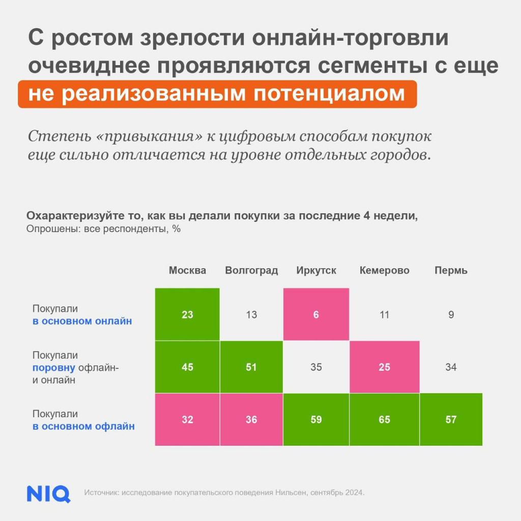 Согласно данным Nielsen, Сибирский федеральный округ является одним из лидеров по темпам роста онлайн-продаж FMCG. Тем не менее, даже в крупных городах этого региона, таких как Иркутск, доля потребителей, предпочитающих онлайн-покупки товаров повседневного спроса, составляет всего 6%. Для сравнения, в Волгограде этот показатель достигает 13%, а в Москве — 23%.