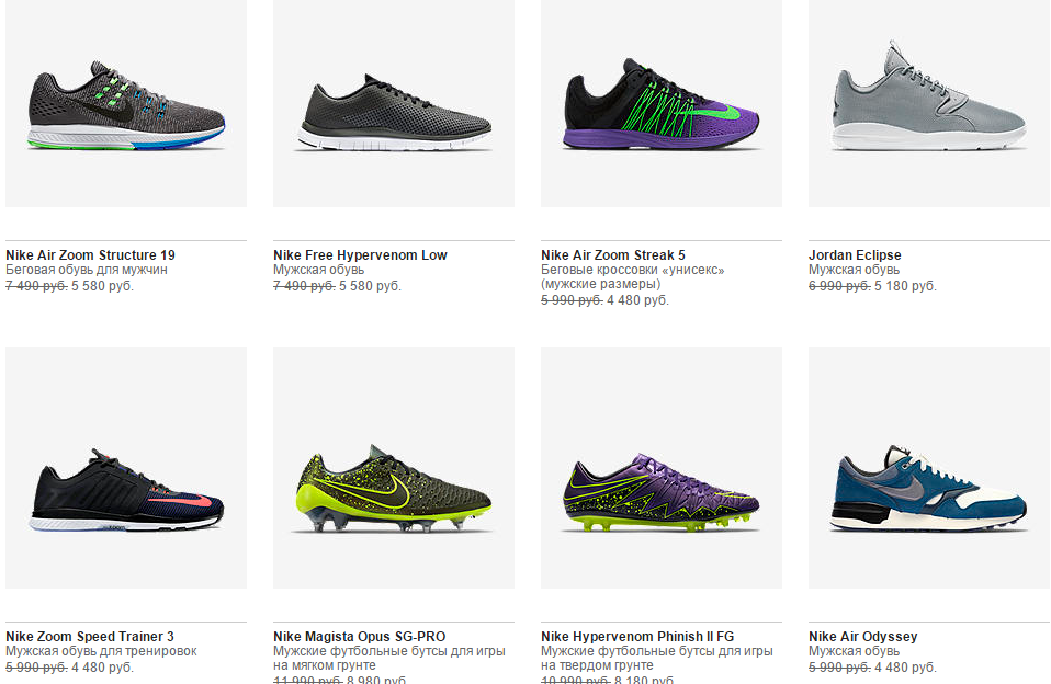 В настоящий момент ассортимент интернет-магазина Nike насчитывает более 80 товаров, среди которых не только кроссовки, но и футболки, бутсы, толстовки, спортивные штаны, кепки и носки.