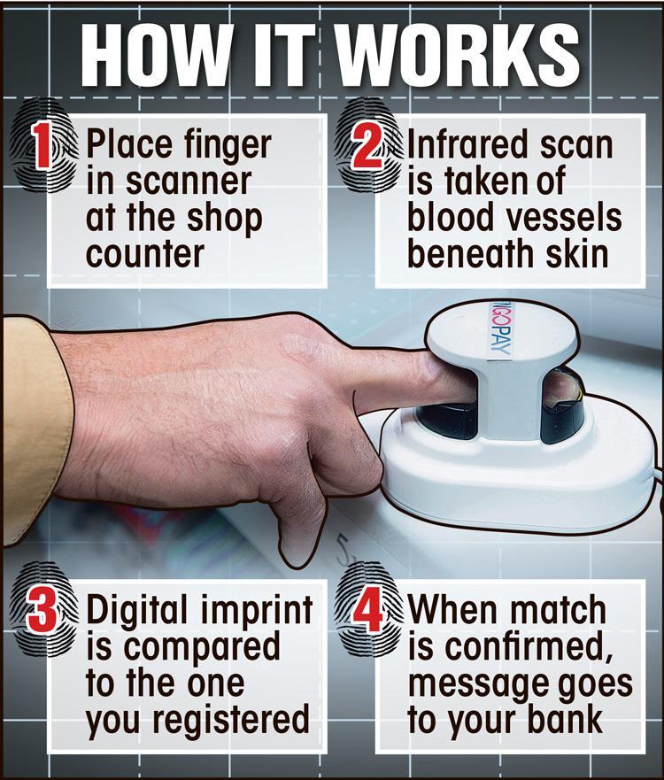 Специальные терминалы биометрической оплаты Fingopay позволяют считывать рисунок вен на пальце. После этого система сравнивает этот паттерн со снимком рисунка вен, приложенного к банковской карте пользователя.