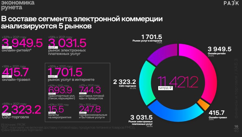 Сегмент электронной коммерции вырос на 32% относительно 2021 года, до 11,4 млрд руб. Объем интернет-рекламы и маркетинга в 2022 году составил 389,2 млрд рублей, что на 10% меньше, чем в 2021 году. А вот рынок медиа и развлечений сократился на 52%, составив 73,6 млрд рублей.