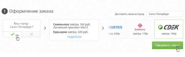 При оформлении заказа покупатель может выбрать подходящие условия доставки курьером по сроку и стоимости доставки, либо выбрать оптимальный пункт выдачи заказа - на интерактивной карте пункты самовывоза могут быть отфильтрованы по способу платежа, графику работы, также возможно определение ближайшего к введенному покупателем адресу пункта, отображение точек с бесплатной выдачей заказа.