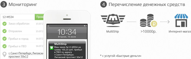 4. При оплате заказа наличными интернет-магазин вынужден ожидать перечисления средств от службы доставки. MultiShip предлагает 2 финансовых инструмента для ускорения оборота денежных средств: быстрые и очень быстрые деньги.