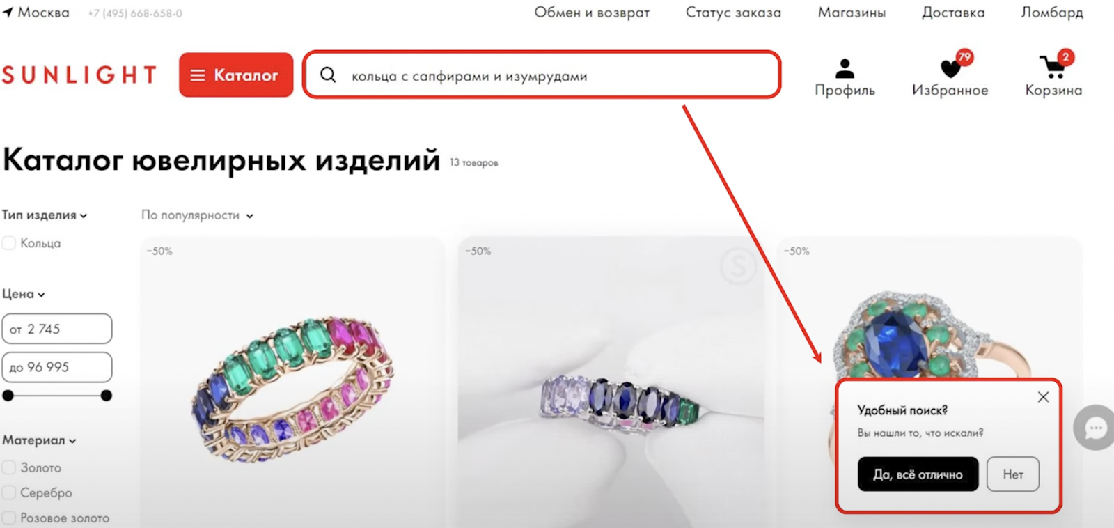 Обработав все оценки, мы улучшили выдачу по нескольким популярным запросам. Например, «бесконечность» (такой запрос вводили пользователи, которые искали украшения в форме перевернутой восьмерки), «недорогие золотые кольца», «акции».
