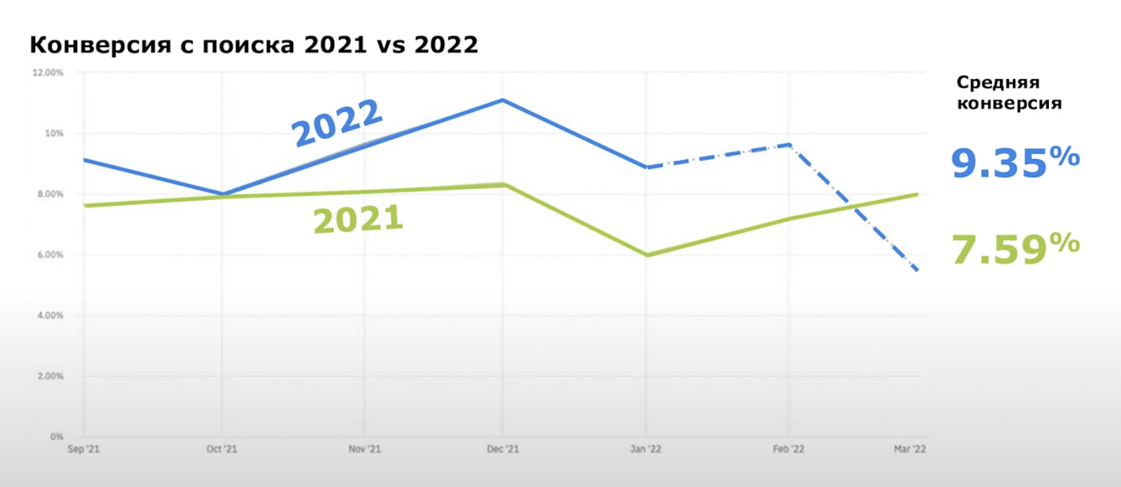 И в результате получили значительное улучшение конверсии — с 7,59% в 2021 году до 9,35% в 2022-м:
