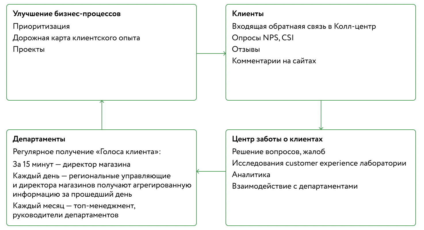 Вся информация, полученная от покупателей, поступает в Управление заботы о клиентах, которое объединяет контакт-центр и команду аналитиков. Там данные обрабатывают и систематизируют — и передают в подразделения, которые используют их для улучшения бизнес-процессов.