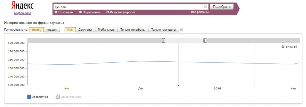 Сделанные выводы подтверждает и динамика суммарного спроса в Яндексе по всем запросам, содержащим слова "купить". Обратите внимание, что на графике шкала спроса начинается не от нуля, поэтому хотя вы видите колебания, относительно общей величины они малы.