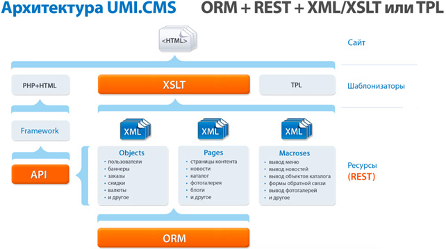 Дизайн UMI.CMS предполагает максимально прозрачную структуру:- объектно-ориентированная модель данных, управляемая шаблонами данных — унификация представления данных в системе;