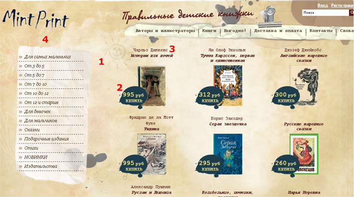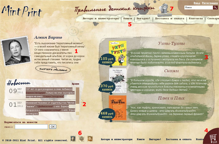 Добрый день! Продолжая рубрику "Оценка юзабилити", рассмотрим сегодня достаточно необычный по дизайну интернет магазин книжной продукции Mint Print. Магазин достаточно молодой, и только только выходит на интернет-рынок книг. Сам дизайн выполнен в достаточно приятных тонах, видна проработанность дизайнером общей идеи, но... Как обычно, всегда найдутся некоторые элементы, над расположением в макете которых необходимо задуматься. Перейдем к их рассмотрению.