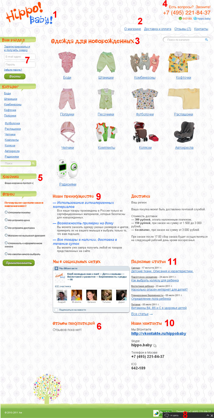 2 - Попробуйте подтянуть этот блок по центру страницы. Одновременно нужно куда то прицепить и текст из блока №3, потому как он пытается охарактеризовать каталог вашей продукции. Видимо, еще с открытия магазина, вы не изменили эту надпись, т.к. в самом каталоге появились и коляски и иные предметы для детей. "Товары для новорожденных" будет выглядеть неплохо как описание к заголовку интернет магазину. Смысл изменений в том, что имеющийся хедер на данный момент выглядит пустым. Возможно это и хорошо, т.к. меньше напрягает и отвлекает от главной цели - каталога.