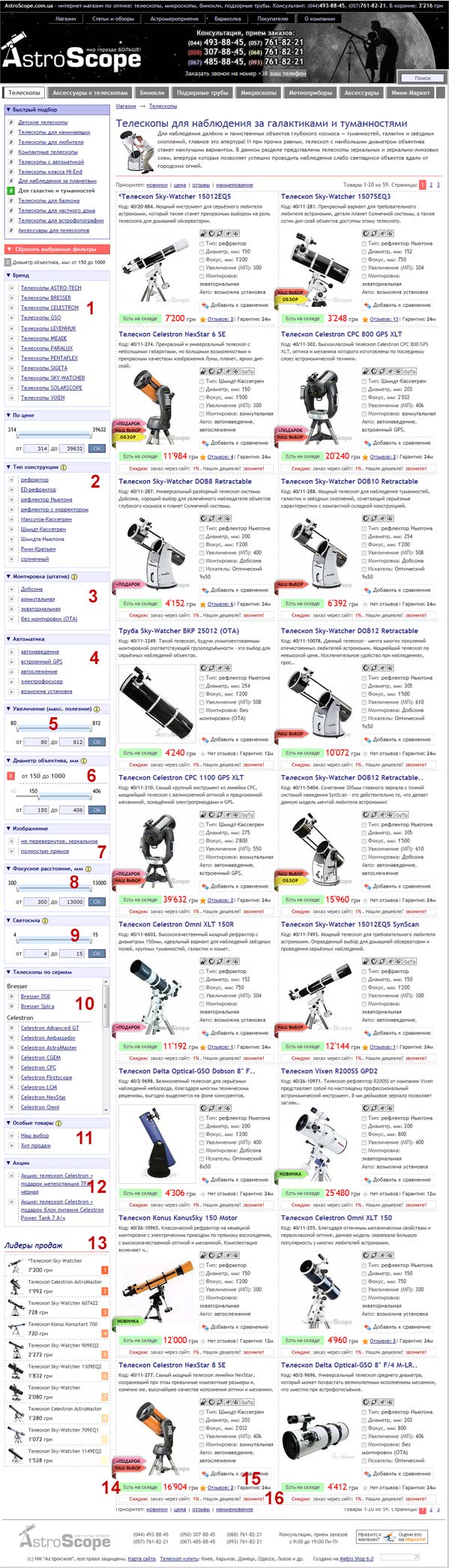 8 - Это, как мы поняли, комплектующие и доп. товары для категории "Телескопы"? Если да, то это ясно не с первого раза. Добавье заголовок к нему. И перенеся "Новинки" вверх, вы разгрузите эту часть, что улучшит концентрацию внимания на ней.