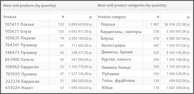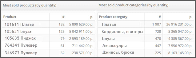 Также в интерфейсе пользователи найдут полезную статистику: продукты-бестселлеры, товарные категории-бестселлеры, товары с наибольшей долей в обороте магазина, категории с наибольшей долей в обороте магазина.
