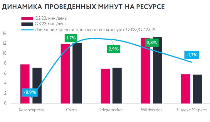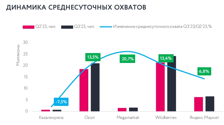 Лидером по показателю охвата за квартал остается Ozon, в свою очередь Wildberries удерживает ведущую позицию по среднесуточным охватом. В среднем более чем 24 млн пользователей посещали Wildberries хотя бы 1 раз за день.