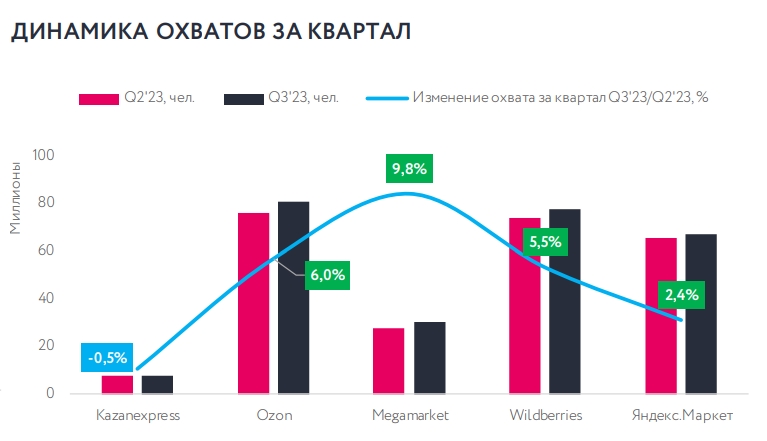 Megamarket активнее своих конкурентов наращивает аудиторию, показывая наибольший прирост по увеличению как общих охватов за период (+9,8%), так и среднесуточных охватов (+20,7%).