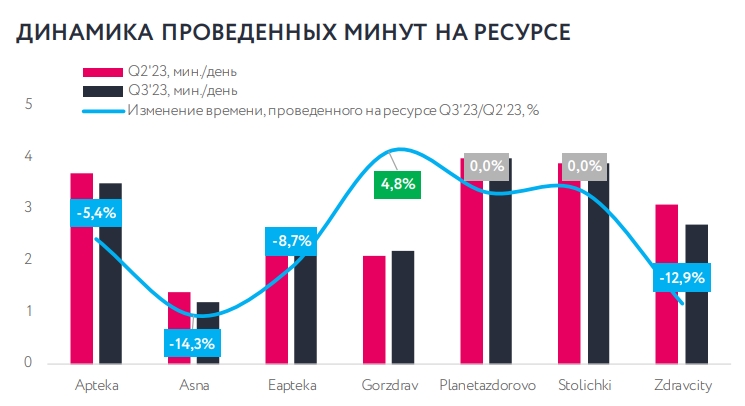 А вот время, проведенное в онлайн-аптеках, в среднем, сокращается, а динамика охватов в Q3 показывает разнонаправленную динамику.
