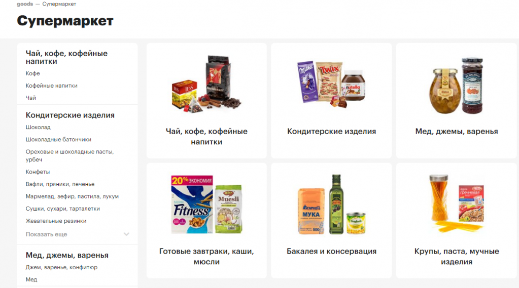 В начале апреля мы сделали тестовый запуск нескольких товарных групп из категории Food – Чай-кофе, Кондитерские изделия. Сейчас на витрине совсем немного таких товаров - – около 3 тысяч, но в ближайшее время планируем существенно расширить товарную матрицу.