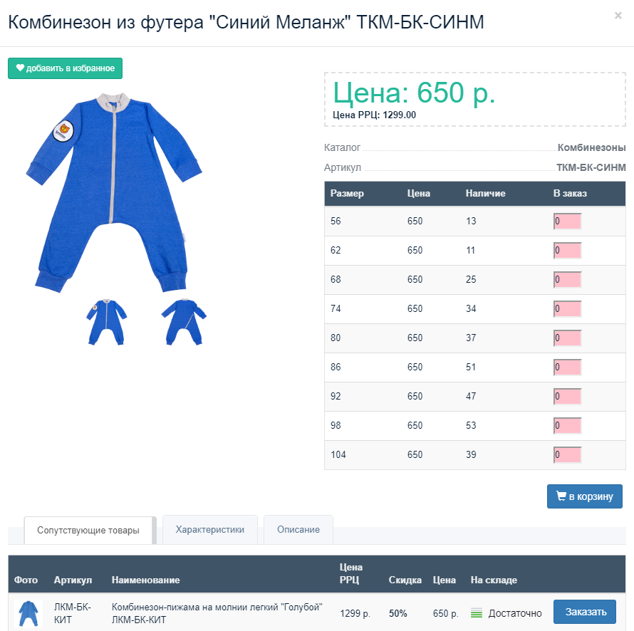 Ещё один инструмент предназначен для покупателей "Бамбинизона", которые привыкли заказывать сразу несколько товаров одного и того же артикула, но разного размера или цвета. Была разработана специальная матрица выбора товара.