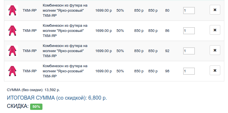 Клиент, заходя на сайт, сразу понимает, на какую скидку при каких условиях покупки он может рассчитывать. Сумма скидки автоматически применяется к новым добавленным в корзину товарам. При этом цена за весь заказ автоматически пересчитывается.