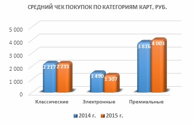 Что интересно: средний чек покупок по электронным картам упал в 2015 году на 102 рубля, по классическим практически не изменился, а по премиальным даже вырос на 187 рублей. Возможно, это связано с падением покупательной способности людей, которые обычно совершают недорогие покупки. Те же, кто покупает много с премиальных карт, сейчас платит больше за привычный набор товаров.