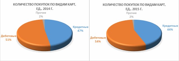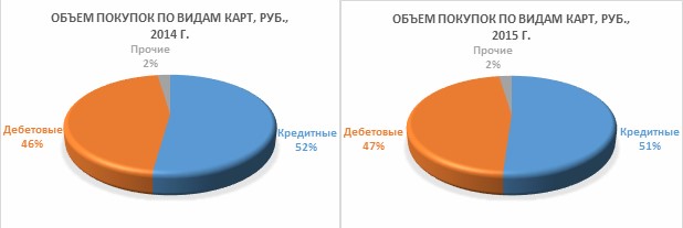 Интересно, что объем покупок в денежном выражении по дебетовым картам в среднем на 4-6% ниже, чем по кредитным, и это соотношение за последних два года практически не изменилось.