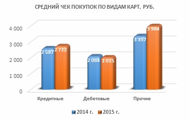 Средний чек покупок по дебетовым картам в среднем ниже, чем по кредитным, причем, в 2015 году разница между ними составила 707 рублей (против 503 рублей в 2014 году). Выше всего чек по предоплаченным и подарочным банковским картам. В Assist считают, что тут играет свою роль специфика этого вида карт, т.к. обычно при покупке используется вся или большая часть суммы предоплаченной карты (как правило, составляющая в среднем 3-5 тысяч рублей).
