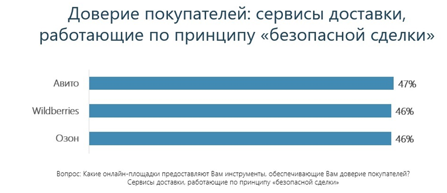 По наличию сервисов доставки, которые гарантируют предпринимателям доверие клиентов, в тройку лидеров вошли: “Авито” (47% голосов участников опроса), у Wildberries и Ozon - по 46%.