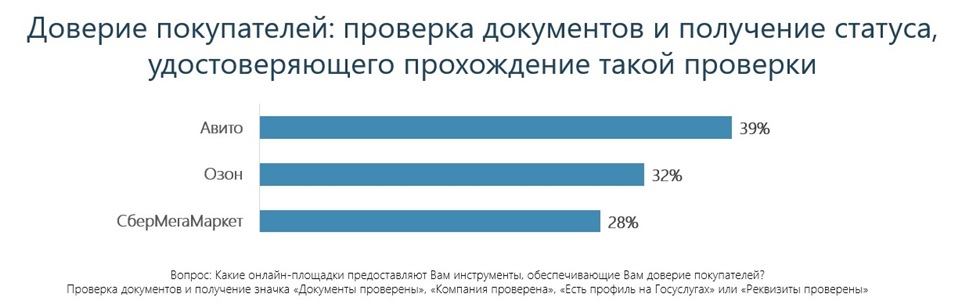 На вопрос, какие онлайн-площадки предоставляют инструменты, обеспечивающие доверие покупателей, большинство компаний из числа респондентов назвали “Авито” (39%), Ozon (32%) и СберМегаМаркет (28%).