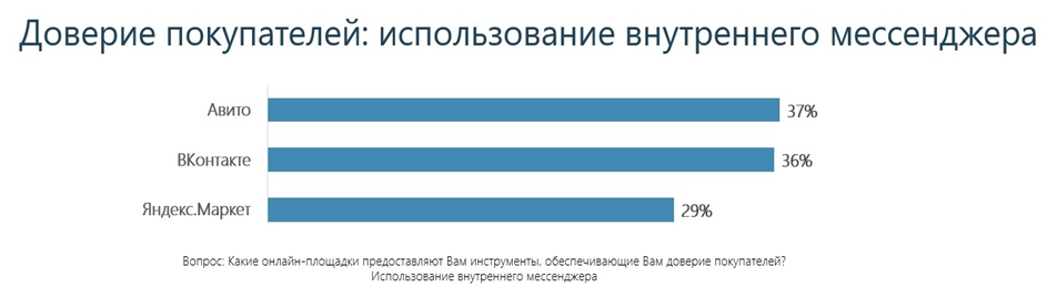 Использование встроенного мессенджера как инструмента повышения доверия покупателей к бизнесу - голоса участников опроса распределились следующим образом: Авито (37%), ВКонтакте (36%), Яндекс.маркет и Ozon - по 29%.
