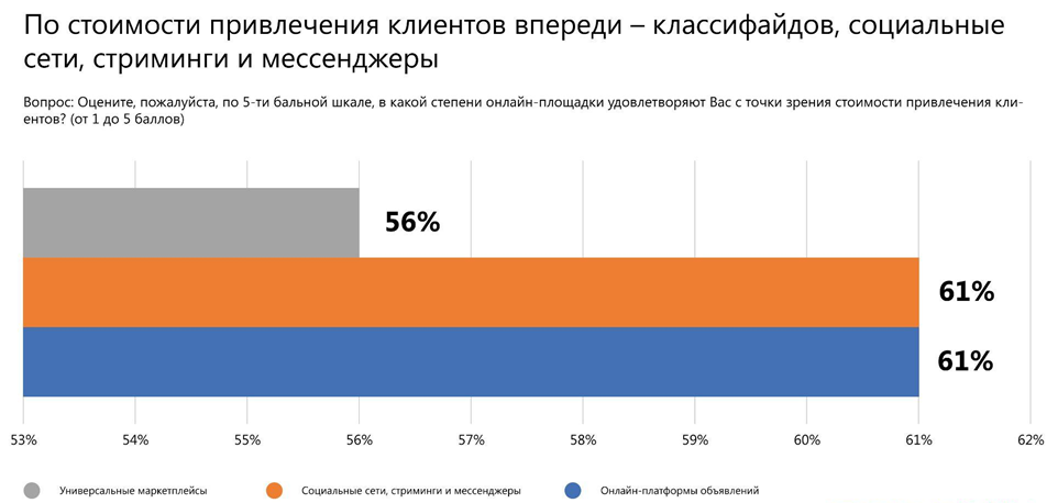 Другой важный параметр для бизнеса — стоимость привлечения покупателя. По этому критерию предприниматели выделили электронные площадки объявлений и социальные сети. 61% участников опроса отметили эффективность онлайн-платформ объявлений и социальных сетей, поставив им высший балл, маркетплейсы получили 56% голосов.