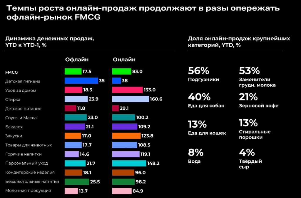 В ряде категорий доля онлайн-продаж уже достигла новых рекордов. Например, 52% подгузников, 40% кормов для собак, 20% зернового кофе, 13% стиральных порошков, 8% воды продаются онлайн.